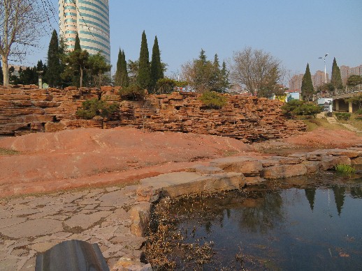 红石公园的由来 整个公园因有较大面积的裸露红石而得名,据考证,那些色彩鲜艳班驳、花纹奇妙多变的红石,生成于距今一亿多年前的中生代侏罗纪,由于受当时地壳运动剧烈,地势分异加剧,气候逐渐转为干燥,受陆相盆地型沉积环境的影响,因而所形成的岩石多为巨厚红色碎屑岩相,通称红层。后因受该时代非常强烈的燕山运动的影响及长时间的风化剥蚀作用,在莱芜境内的侏罗系红层仅残存于近东西向的莱芜八里沟向斜的槽部,分布在莱城及东南一带,因岩性为鲜红色的细中粒长石矿岩,故名为“红石”。