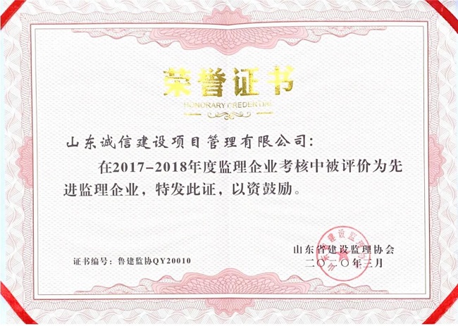 山东诚信建设项目管理有限公司在2017-2018年度监理企业考核中被评为山东省先进监理企业。